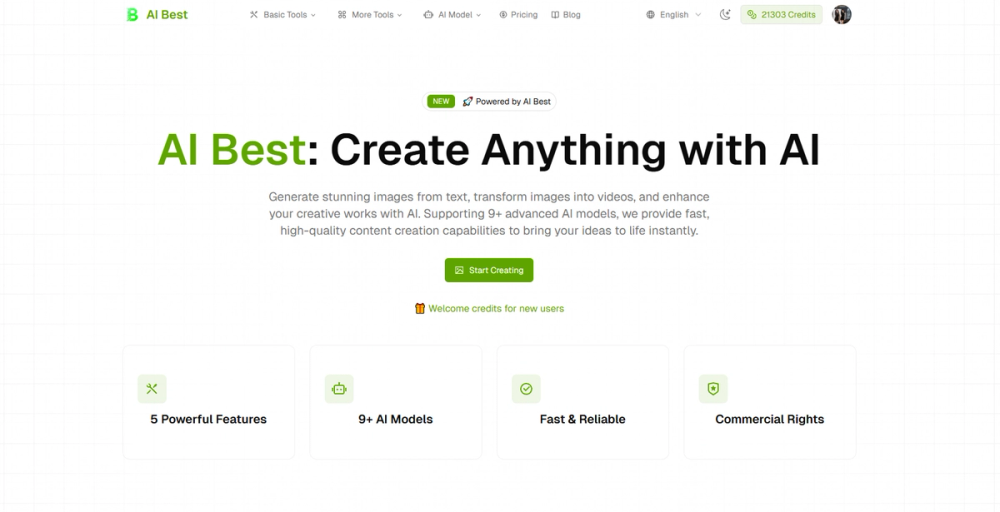 AI Best emphasizes fast, reliable, and affordable content generation, making advanced AI accessible to content creators, designers, and marketers alike. It offers welcome credits for new users and supports commercial rights depending on the plan.