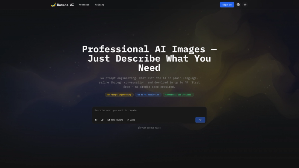 Banana AI is an advanced AI image generator that revolutionizes visual content creation by offering a chat-based interface, eliminating the need for complex prompt engineering. Users can simply describe their desired image in plain language, and the AI generates professional-quality visuals in seconds. The platform is designed for e-commerce businesses, content creators, and marketers, providing a cost-effective and efficient alternative to traditional photography and design processes.