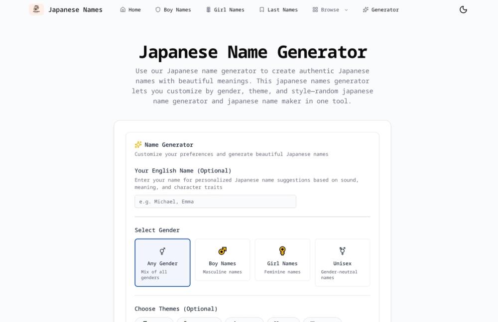 Japanese Names is a comprehensive online platform designed for discovering and understanding Japanese names. It offers an extensive database of over 3,000 first names and surnames, allowing users to search by meaning, gender, and kanji. The platform is built with a search-first approach, providing multiple entry points for users to find names that match their specific intent, whether it's for a new baby, a character in a story, or simply for cultural exploration.