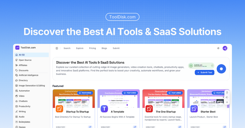 ToolDisk.com is a comprehensive and meticulously curated online directory dedicated to showcasing the best AI tools and SaaS solutions available in the market. It serves as an invaluable resource for individuals, creators, startups, and established businesses seeking to leverage cutting-edge technology to enhance their operations, boost creativity, and drive growth. The platform aggregates a diverse range of applications, from sophisticated AI image generators and dynamic video creation tools to essential productivity apps and innovative software-as-a-service platforms.